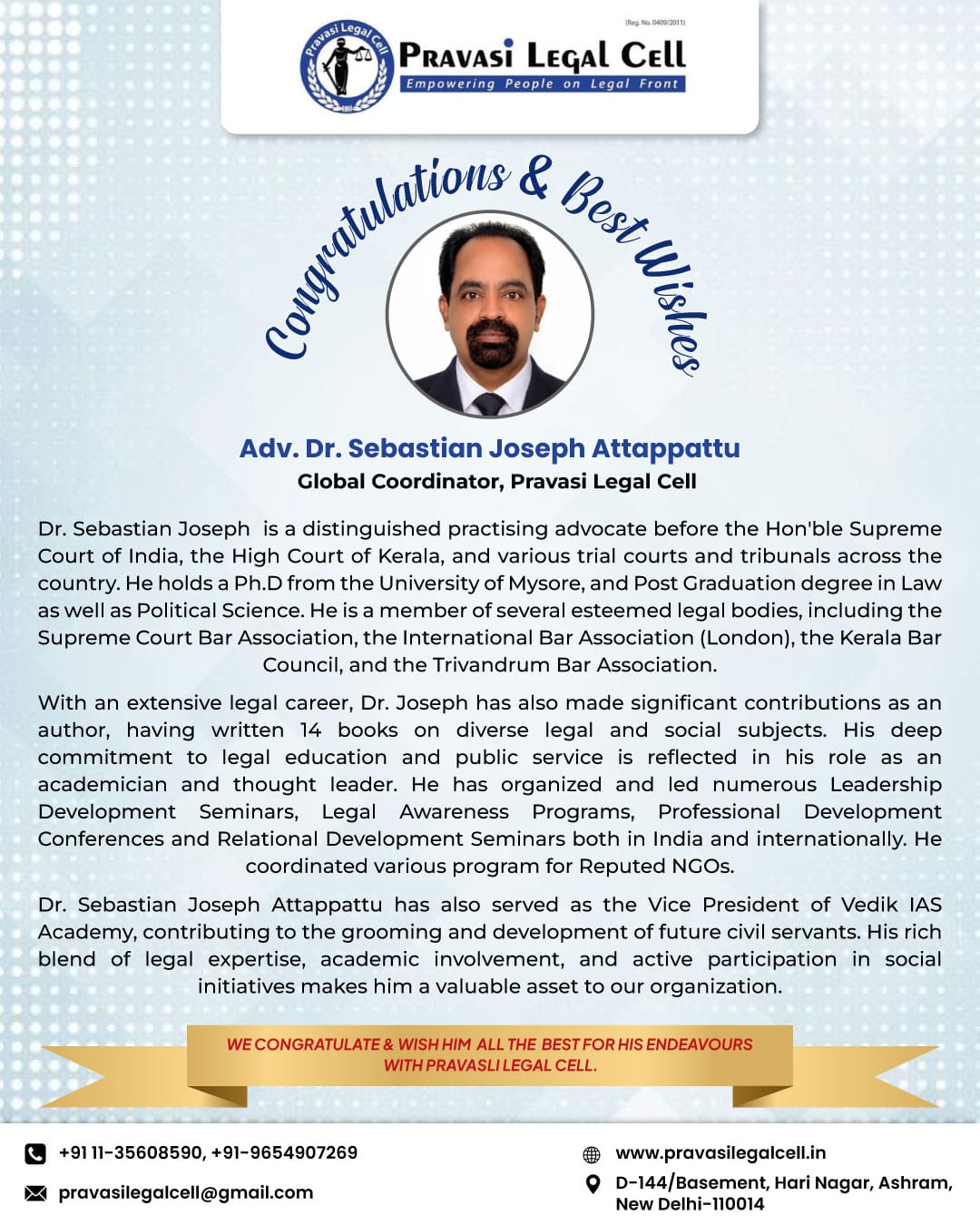 Pravasi Legal Cell is a registered Non-Governmental Organisation founded by Adv. Jose Abraham, who is the Global President of the organisation. Pravasi Legal Cell is a group of retired Judges, Advocates, Social Activists and inspired citizens of India dedicated towards empowering people with the power of law.
