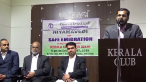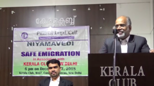 Secretary, (Pravasi Legal Cell) speaks on Safe Emigration. Pravasi Legal Cell organised a Niyamavedi on Safe Emigration in Association with Kerala Club, New Delhi on December 6, 2018.